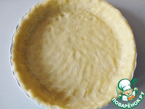 Снимаем верхний лист бумаги, переворачиваем тесто в форму для тарта диаметром 22см, укладываем его, затем снимаем второй лист бумаги. Излишки обрезаем. Их можно завернуть в пленку и хранить в холодильнике в течение недели.