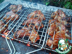 Через 2 часа наступит долгожданное время жарки. Подготовьте угли. Жарить крылышки несложно, но сложность состоит в том, что у нас сладкий маринад, а те, кто хоть раз пытался жарить мясо, замоченное в сладком маринаде, сталкиваются с проблемой: мясо обгорает, потому что сахар начинает гореть очень быстро. Так вот - плюс крылышек в том, что они не очень крупные и быстро набирают температуру для жарки - поэтому их можно достаточно часто переворачивать. Просто не бросайте ваши крылышки и каждые минут 5 переворачивайте - все зависит от жара.