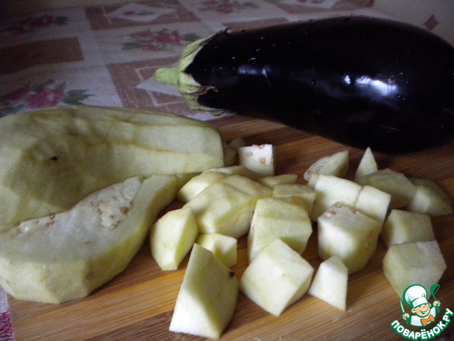 Баклажаны (у меня было 3 крупных) очищаем, нарезаем крупными кубиками. Складываем в глубокую посуду, хорошо солим (примерно 1 ст. ложка соли) и оставляем минут на 30 для того, чтобы ушла горечь.