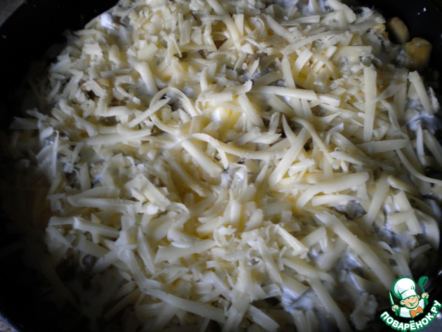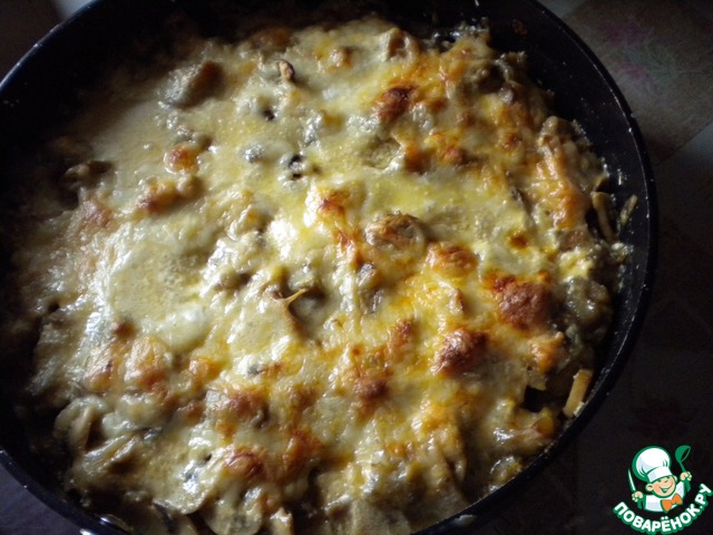 Сверху посыпаем тертым сыром и отправляем в нагретую духовку минут на 30-35. У меня довольно немолодая газовая духовка, поэтому точную температуру не выставишь (колеблется от 180 до 200 градусов).