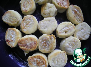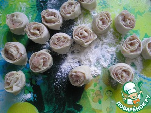 Раскатаем тесто в длинный прямоугольник, потоньше, но не до дыр, размажем равномерно фарш, свернем в рулетик и нарежем штруделей. Пусть пока отдохнут на посыпанной мукой поверхности.