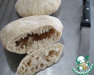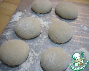 Из двух видов муки, дрожжей, соли, разрыхлителя, воды и подсолнечного (можно брать оливковое) масла замесить тесто, я это делала при помощи хлебопечки. Тесто поставить в теплое место, накрыв салфеткой на 1,5-2 часа, затем разделить его на 6 одинаковых частей (примерно по 115 г) и сформировать шары, оставить их подходить еще 30 минут.