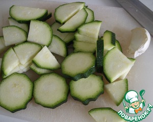 Цуккини нарезать и обжарить в небольшом количестве растительного масла, добавив немного соли и выдавленный через пресс чеснок.