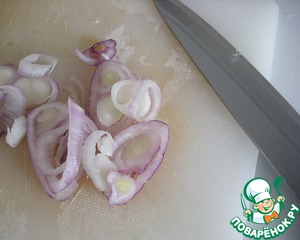 • Оливки и лук мелко нарезать, лук обдать кипятком для удаления остроты.