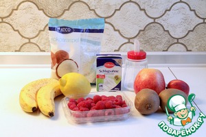 А вот и нехитрый набор продуктов. Разумеется, фрукты и ягоды можно использовать какие душе угодно:) Сюда бы, конечно, отлично вписалась клубника, но у меня ее не было: ( Начинаем конечно с тщательного мытья ягод и фруктов.