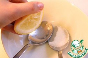 А теперь быстренько делаем "маринад" для фруктов. Выжимаем из бедного лимона сок, 1.5 ст. л. будет вполне достаточно. Соединяем лимонный сок с 1 ст. л. сахара (я добавила прям даже неполную ложку сахара). Теперь поливаем смесью лимона и сахара нарезанные фрукты, тщательно перемешиваем и переходим к следующему этапу. Фрукты пока "маринуются" :) За яблоки и бананы можно даже не переживать - лимонный сок не даст им потемнеть.