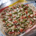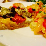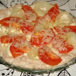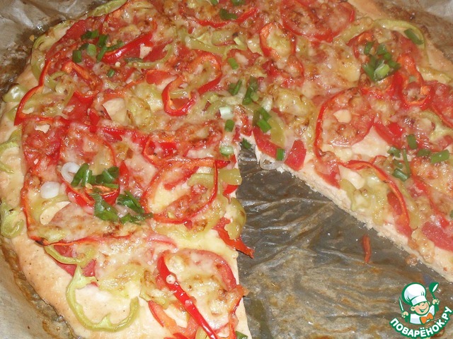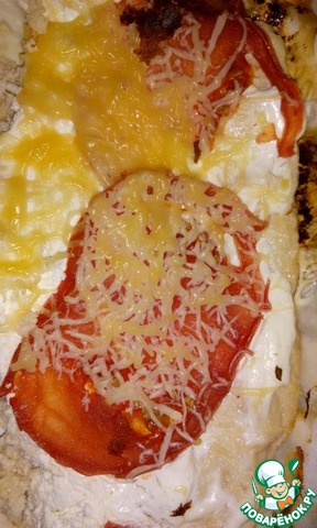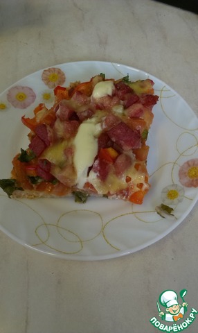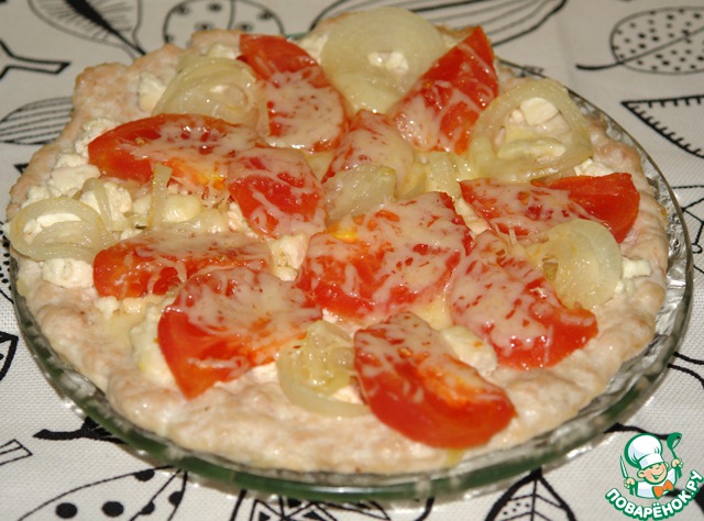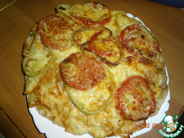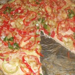 Я присыпала слой соуса фетой, далее помидоры и болгарский перец, нарезанные кольцами.