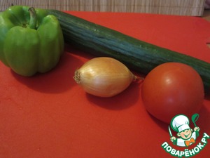 Подготовим овощи: огурец, помидор, репчатый лук и болгарский перец.