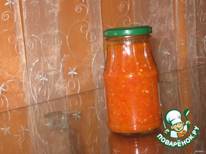 Заготовка: перец сладкий очистить от семян, горький целиком только без хвостика, очищенный чеснок перекрутить на мясорубке, сложить в небольшие баночки (у которых есть герметические крышки). Заполнить баночку, оставляя пару см свободными сверху, крышки не закрывать, а просто накрыть сверху и поставить в темное место при комнатной температуре на 2 дня бродить. Через 2 дня крышки герметично закрыть. Хранить в холодильнике всю зиму (вот только последнюю открыла).