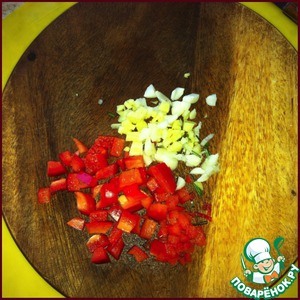 Измельчить мелкими кубиками лук, чеснок, имбирь, паприку.