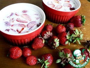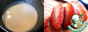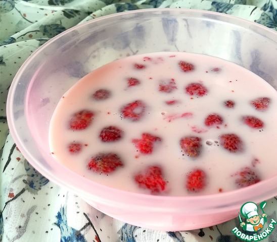 -Клубнику нарезать на небольшие кусочки, залить молоком.