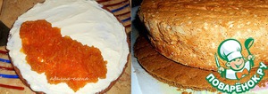 Собрать торт: медовый корж, крем, яблоки, крем, бисквит (щедро увлажнить сахарным сиропом), снова крем, яблоки, крем, медовый корж. Медовые коржи я также немного пропитала сиропом, чтобы не были сухими.
