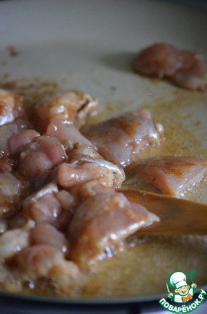 Филе курицы промыть, нарезать на мелкие кусочки, по вкусу добавить специи, замариновать в соевом соусе 30 мин.
