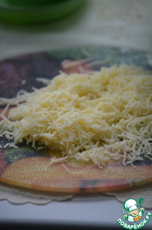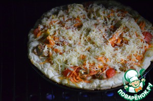 Затем пиццу вынуть, посыпать тертым сыром и выпекать еще 10-15 мин.