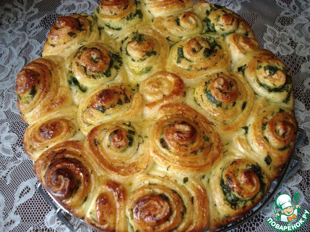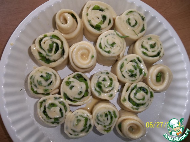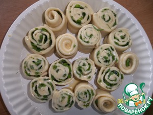 Смазываем форму растительным маслом и выкладываем завитки так, чтобы между ними было небольшое расстояние. Смазываем взбитым яйцом.