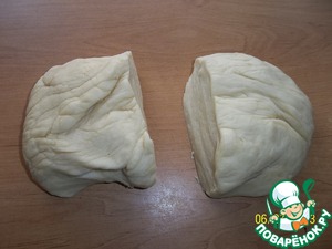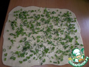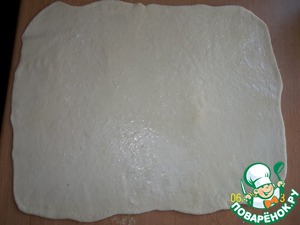 Каждую половину раскатываем в тонкий прямоугольник, смазываем растительным маслом, присыпаем щепоткой соли.