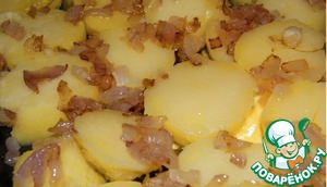 Распределить по всей поверхности картофеля лук, который предварительно нарезать и слегка обжарить в 2 ст. л. оливкового масла. -