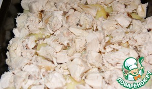 Сверху выложить филе, нарезанное кубиками 1х1 см.