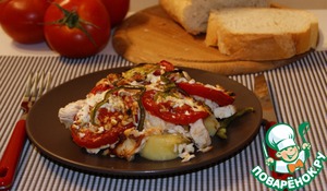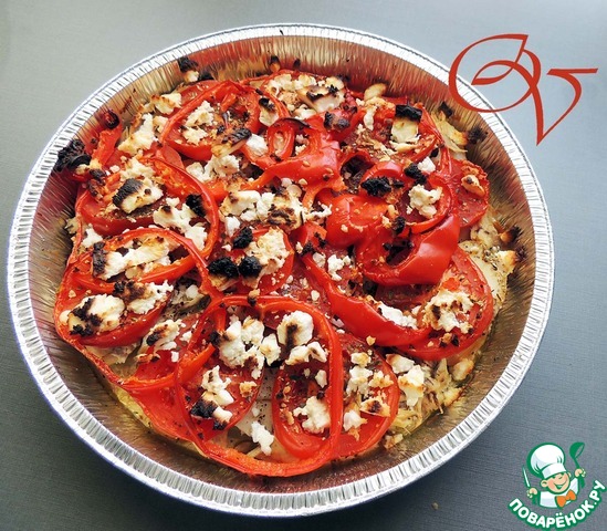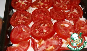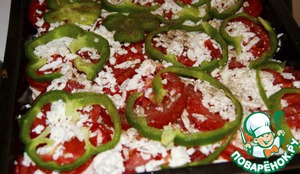 Перец порезать тонкими кольцами и выстелить поверх помидоров.