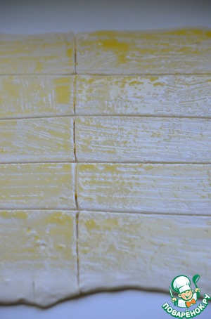 Тесто раскатайте в пласт, нарежьте его на полоски, смажьте яйцом.