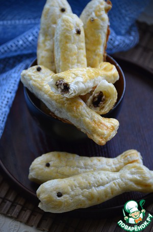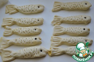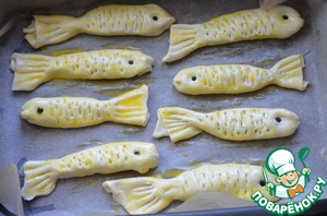 Уложите рыбок швом вниз на противень, покрытый пекарской бумагой. Смажьте яйцом и выпекайте в духовке при 180С до золотистого цвета.