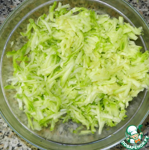 Кабачок натереть на крупной тёрке, посолить и дать стечь воде.