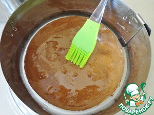 Выкладываем первый корж на блюдо. Вокруг устанавливаем форму диаметром 22 см. Смачиваем его сиропом.