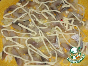 Селедку лучше брать слабосоленую, так как салат и так острый. Очистить, нарезать небольшими брусочками, выложить на лук половину, легкая сеточка из майонеза.