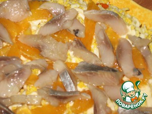Мелко порезать апельсин, выложить, потом оставшуюся селедку - майонез (апельсин в салате совсем не чувствуется, он только смягчает остроту и соленость, можно заменить яблоком, но с апельсином вкуснее)