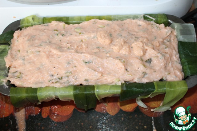 Форму для террина (у меня на 2 литра) смазала сливочным маслом и выложила листами бланшированного порея чуть внахлест и чтобы свисали