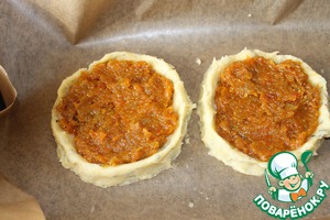 На бумаге для выпечки выкладываем основу (сразу оговорюсь, что лучше это делать в форме, т. к. во время выпечки основа чуть растеклась).