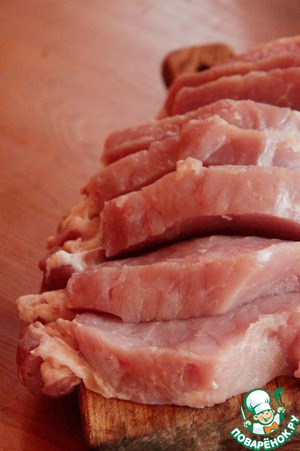 Для начала нам нужно нарезать карбонат на кусочки. Я беру его без кости, чтобы мясо готовилось быстрее.
