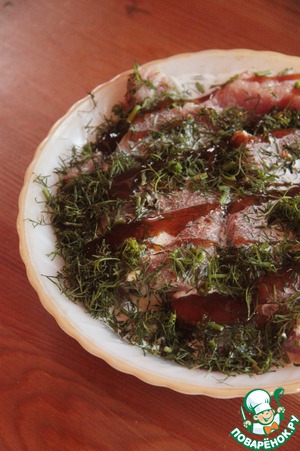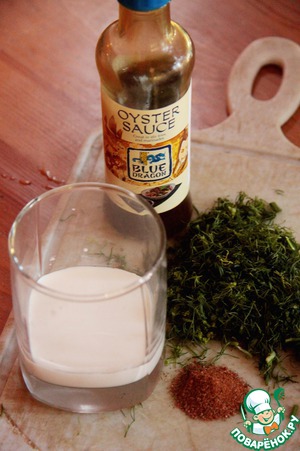 Для маринада порежем мелко укроп, приготовим смесь перцев, сливки и устричный соус.