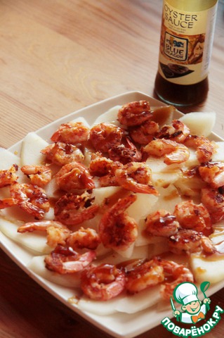 Добавляем сверху креветки и поливаем устричным соусом. Невероятная закуска, в которой сочетается сладкое, острое и соленое.