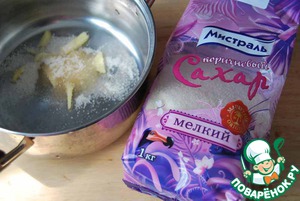 Помещаем порезанный имбирь в кастрюльку и засыпаем сахаром.