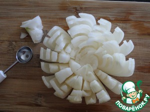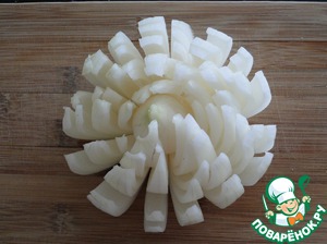 Почистить лук. Срезать один край (оставить корневую часть). Положить плоской стороной вниз.
