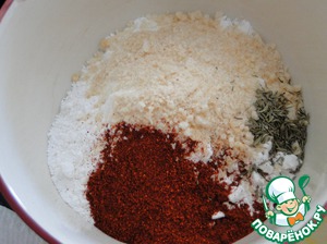 Яйца взболтать с молоком, отставить. В другой миске смешать муку, пармезан, паприку, орегано, соль.