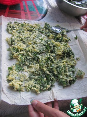 Лист лаваша разворачиваем, на середину выкладываем половинку начинки.