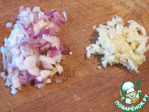 Мелко режем лук и чеснок. Можно чеснок на чеснокодавку.