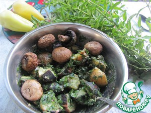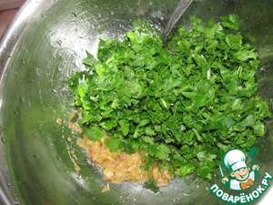 Пока пеклась картошечка, я в миску переложила жидкую часть соуса и добавила нарезанную зелень:у меня пучок петрушки и пучок укропа. Перемешала.