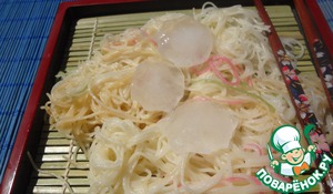 Подаём с отваренной лапшой. Японцы, кстати, в жару лапшу едят со льдом, полив её немного соевым соусом.
