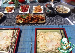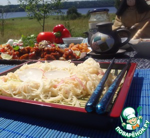 Лапшу также подают в специальных тарелках с бамбуковым ковриком внутри. Ну, вам совсем не обязательно это иметь, можно и в обычную тарелку положить. Это я просто расстаралась для красивой презентации своего рецепта ))).