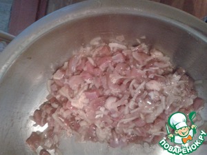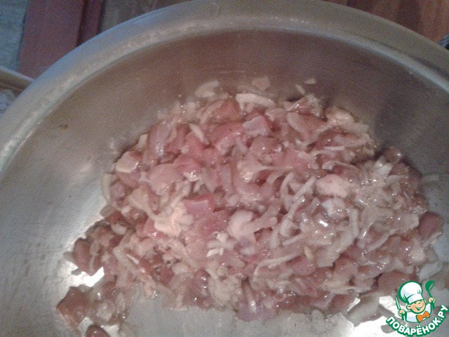 Готовим начинку. Очищаем окорочка от кожи и костей, режем мясо кубиками 1см на 1 см, режем репчатый лук, кто как любит - мелко, полукольцами или четвертинками. Добавляем в мясо, солим, перчим, перемешиваем. Начинка готова.