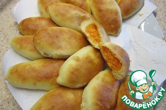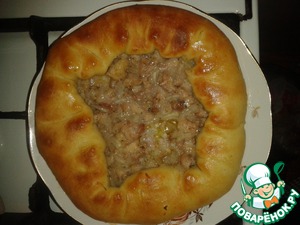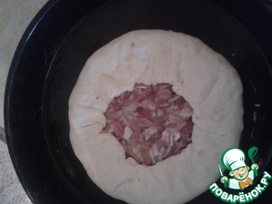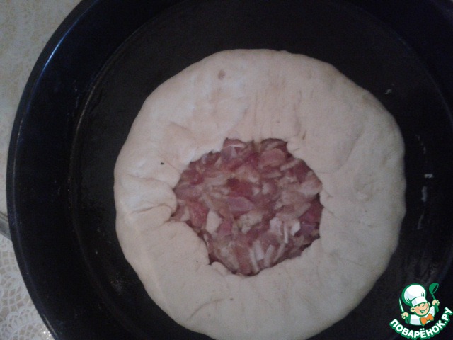 Оставляем минут на 10, укрыв пленкой, чтобы легче раскатать. Затем раскатываем круг из теста, не тонко, где-то 1 см толщиной. Выкладываем в центр начинку равномерно, края теста оставляем, чтобы завернуть внутрь. Заворачиваем, придавливаем ручками равномерно, чтобы начинка распределилась внутри одинаково и отправляем в духовку. -
