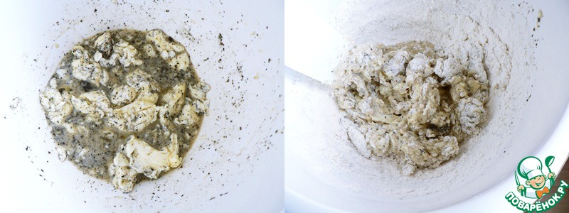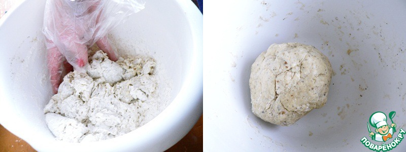 -Добавить часть муки и начать замешивать тесто. -