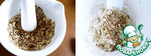 -Грецкие орехи размельчить в ступе, добавить в тесто и снова тщательно перемешать.