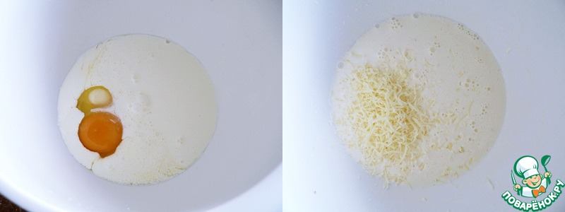 -Для заливки: 1 куриное яйцо со сливками и мелко натёртым сыром тщательно перемешать, затем добавить ещё одно яйцо и всё взбить венчиком.