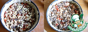 -Выложить в форму часть грибов, сыр нарезать кубиками, выложить поверх грибов.