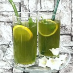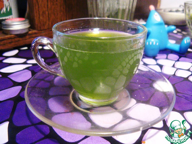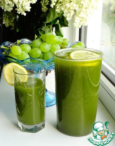 Полученную массу жизнерадостного зелёного цвета смешать с 0.5 л. воды, 200 мл. имбирного сиропа и лимонным соком.