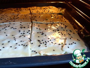 Посыпаем черным тмином, разрезаем изделие ножом для пиццы на 9 частей (так удобно) и отправляем в духовку, разогретую до 180 град. Ц, с вентилятором.